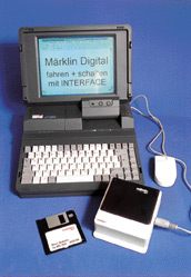 Control de máquinas, o Keyboard ou a Memory. Também o Interface possui a capacidade de receber sinais dos Encoders de via e retransmitindo-os ao computador cujo software actua em conformidade. Na figura acompanhado por um Laptop, respectivo rato e diskette de aplicações. |