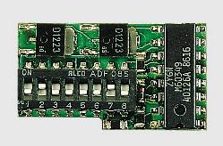 rotativo, gruas, iluminação, etc. Podem ser codificados de 1 a 255 (possibilitando o controlo de até 255 acessórios) Estes decoders subdividem-se em dois tipos: 6083 - decoder de impulso momentâneo (até 1 ou 2 segundos), findo esse tempo cessa a ligação eléctrica 6084 - decoder de comutação que mantém, até novo comando em contrário, uma ligação eléctrica. Mantém dois estados: esquerdo/direito, vermelha/verde, ligado1/ligado2, etc. Normalmente encontra-se instalado na parte de baixo da maquete (na zona das ligações eléctrica), mas também existem versões para montagem directa nos acessórios. |